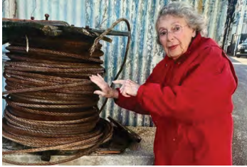 Helen Valentine pointing to a bail of cable wire at Taave’s Boat Yard