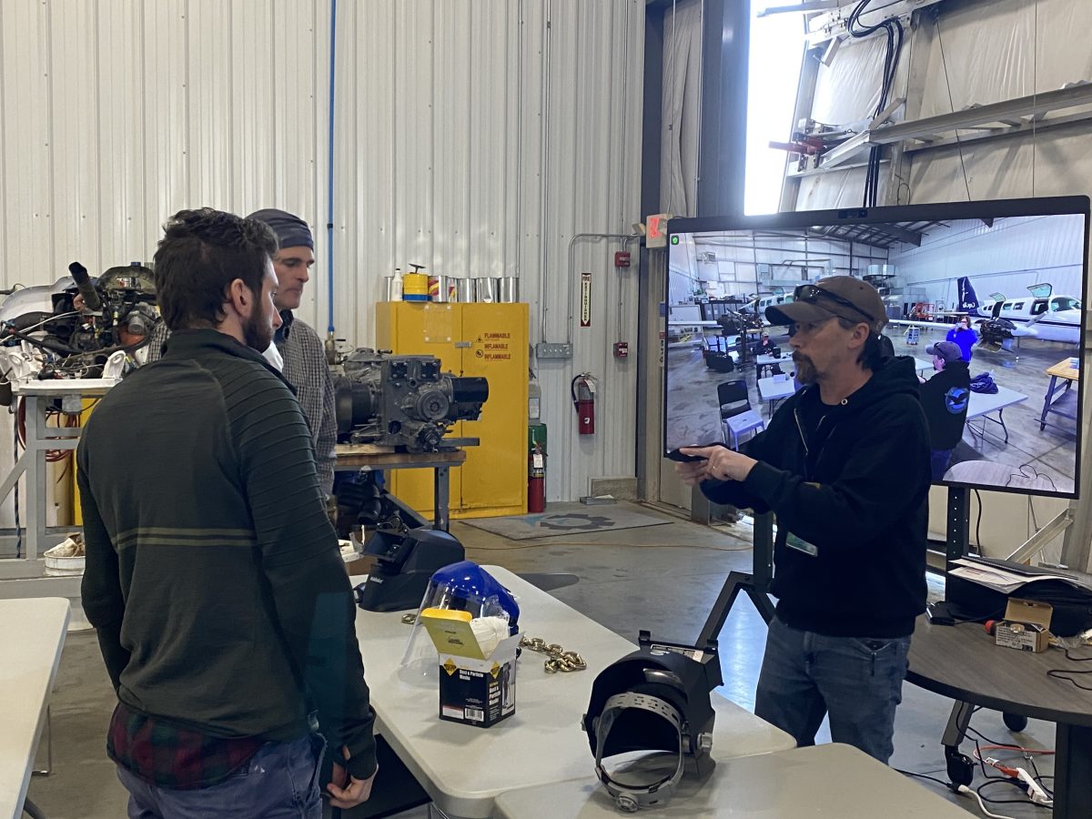 Instructor Sean McCarthy gives tips to Captain Kurt Martin and oyster farmer Connor Doyle, foreground. The welding class at Cape Cod Community College’s location at Plymouth airport focused on stick and metal inert gas (MIG) welding, also touching on Tungsten Inert Gas, (TIG), which is a bit more complex.