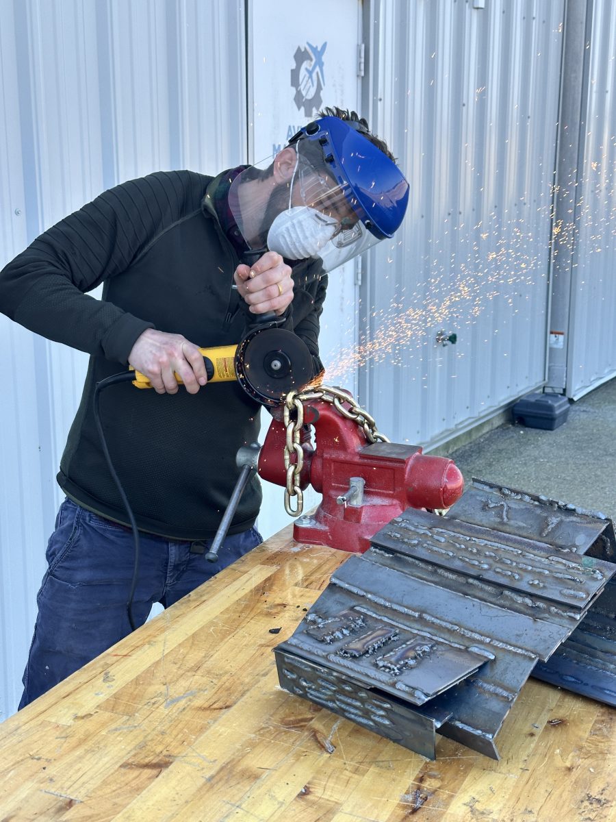 Connor Doyle prepares the welding surface.