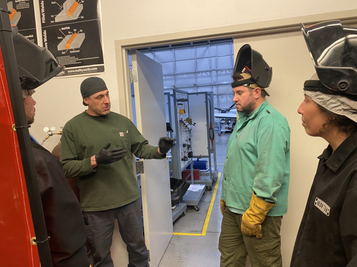 Instructor Travis Balderston talks to the group before they weld.